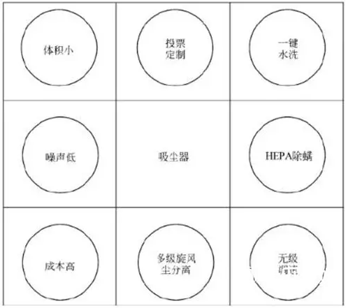 瑞士可水洗医疗级HEPA过滤。过滤效果可高达99.97%。了解了将要推广的吸尘器之后,假如文案创作者要用九宫格思考法来为这款产品创作文案,其九宫格图可以参照下图来写。