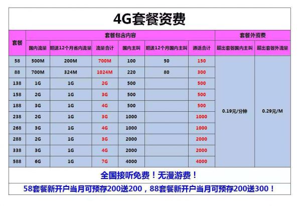 1.移动4G飞享套餐,国内通话:含30分钟本地主叫国内时长,超出后国内主叫0.19元/分钟(不含港澳台、国际电话),国内接听免费。上网流量:手机上网0.29元/MB,赠送来电显示。当月申请,次月生效。并额外赠送12个月,每月20分钟本地主叫本地时长+30M省内流量。